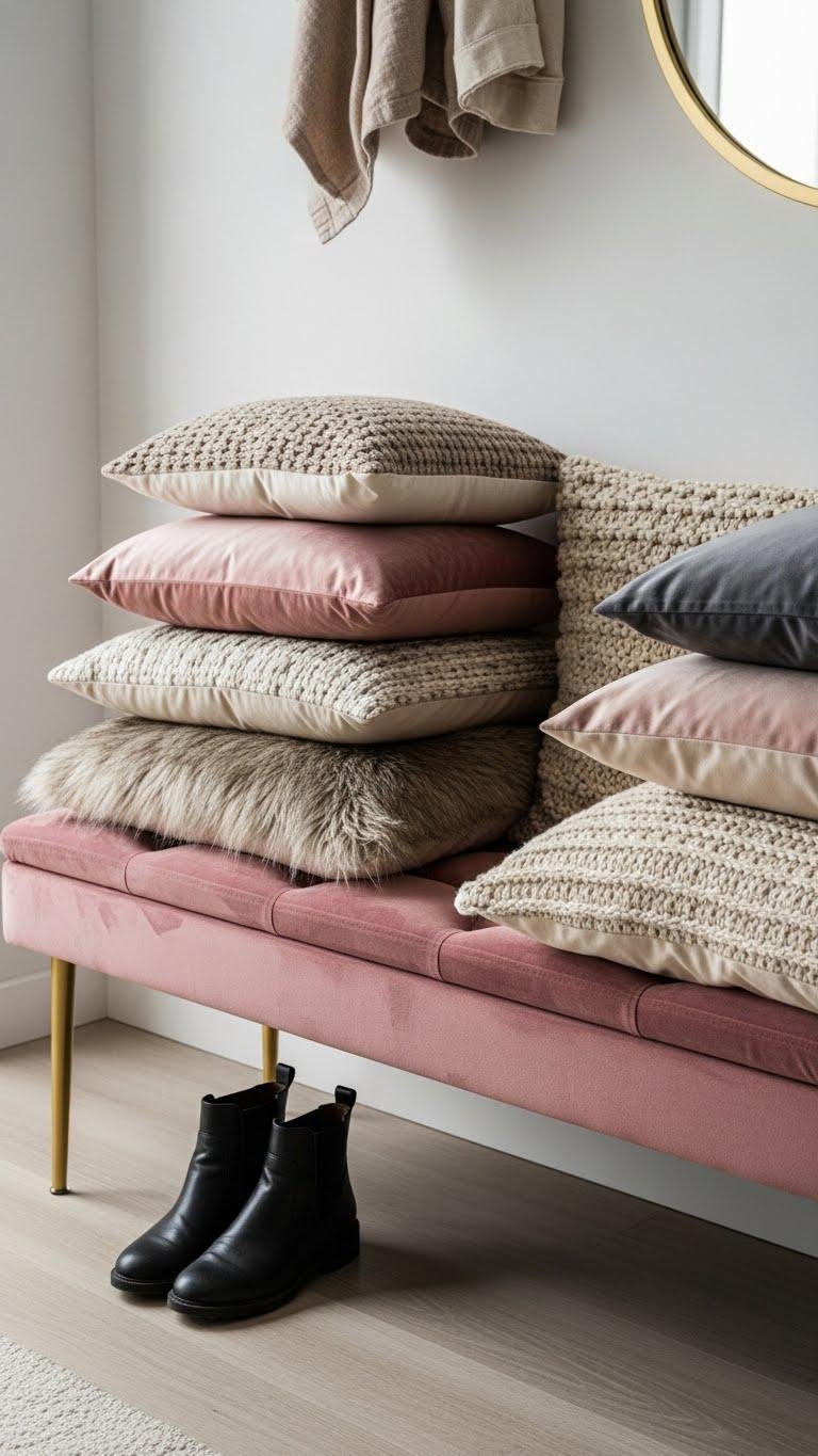Tuck a pink velvet bench into your entryway to make an immediate, luxe statement that still feels welcoming; layer it with pillows in mixed textures—silk, knit, and faux fur—to add depth and invite you to pause. You’ll enjoy the velvet texture under your hand and smart pillow layering that balances color and scale, creates cozy function, and keeps the space open and liberated.