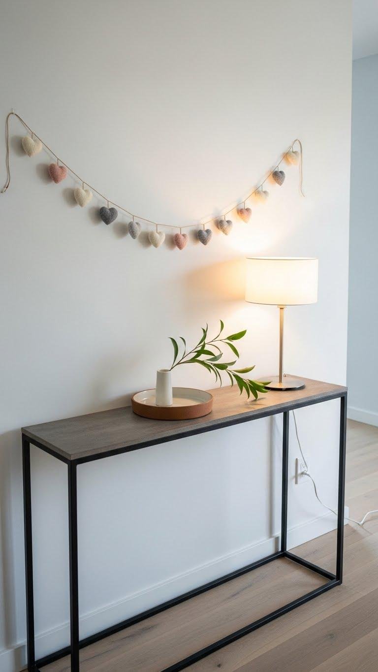 Often a single, understated element can change the mood of your entryway: hang a minimal heart garland above the console to add instant charm without clutter. You’ll create a clean, confident minimal vignette using wool hearts on a thin cord. Keep console styling simple—a lamp, a small tray, and a sprig—so the garland breathes and your space feels liberating.