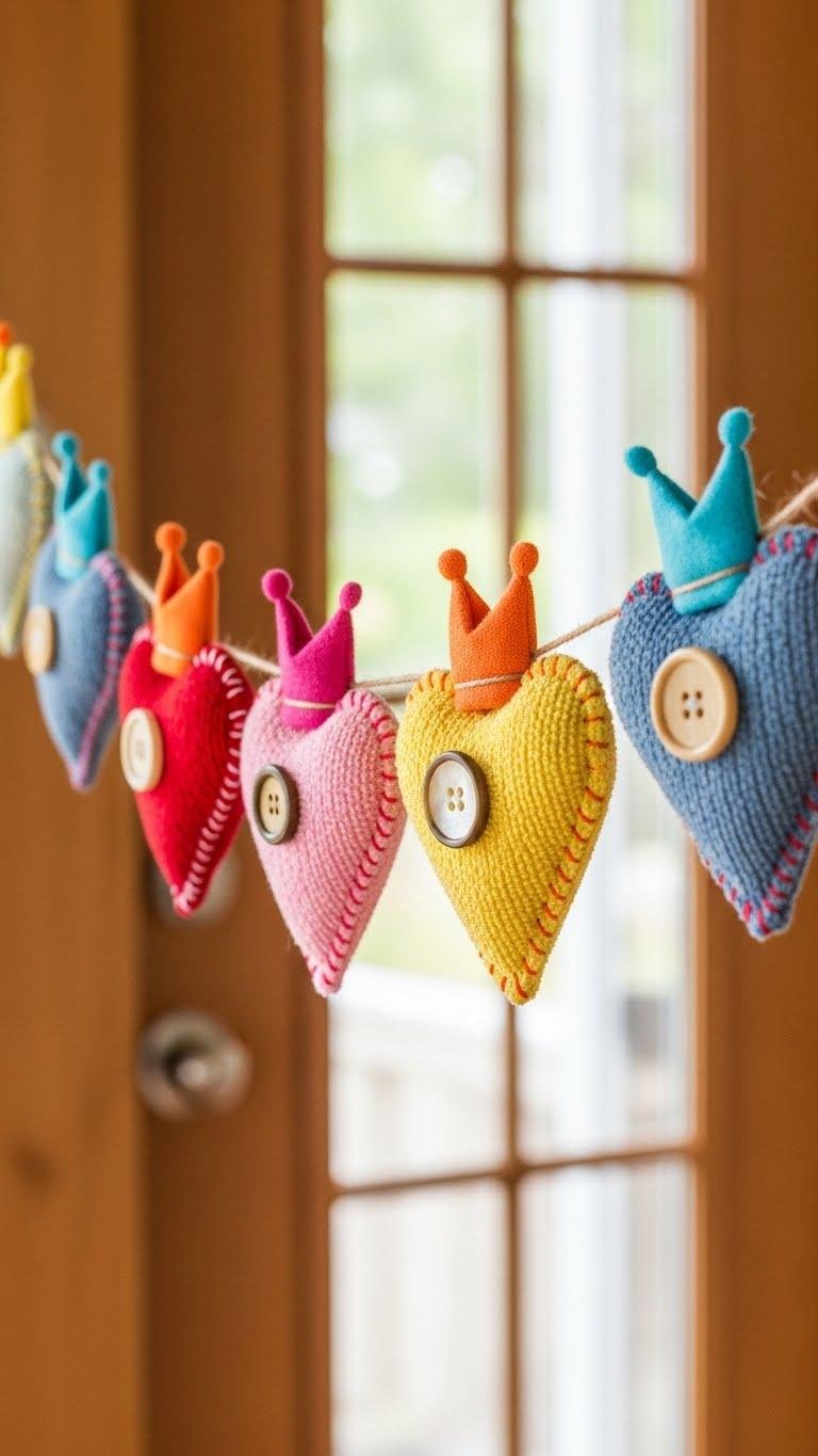 If you loved the woven blind’s quiet texture, keep that cozy, handcrafted feel going by making a DIY heart garland from everyday dishcloths. Cut hearts, stitch edges, and add dishcloth crowns for playful tops. Thread with twine, spacing evenly, and sew button centers on each heart for a vintage touch. Hang in the entryway to welcome guests with homemade charm.