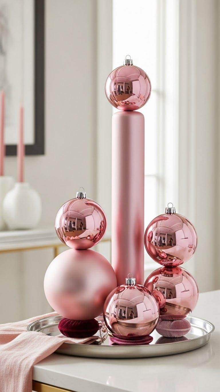 Layer a trio of pink-hued ornaments on your entry table to create an instantly luxe, curated vignette. Place layered baubles at varied heights on a sleek tray, mix matte, gloss and metallic finishes, and tuck subtle velvet accents beneath one or two pieces. You’ll invite tactile warmth and effortless glamour while keeping the look minimal, open, and ready for guests to enjoy.