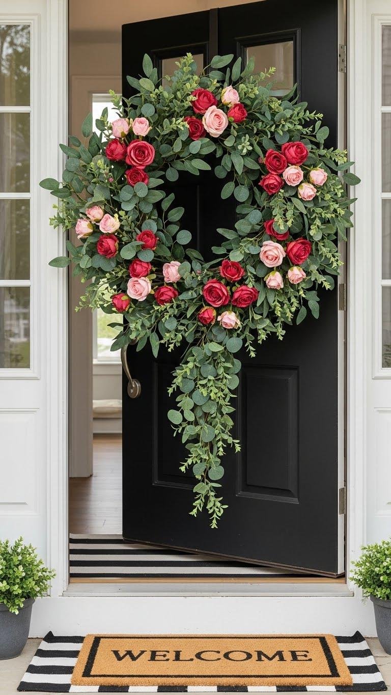 You’ll welcome guests with lifelike rosebud clusters and trailing faux eucalyptus that won’t wilt. It’s lightweight, weather-resistant, and ready to hang—perfect if you want decor that’s bold but effortless.