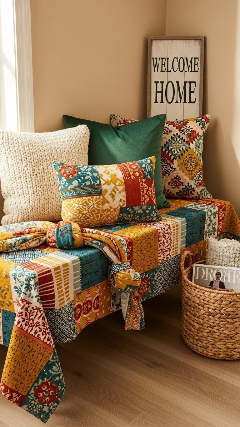 For a quick refresh, toss a TextileLayers tablecloth from Dollar General over an entryway bench or console to add instant color and texture—you’ll get the look of a curated throw without the cost.