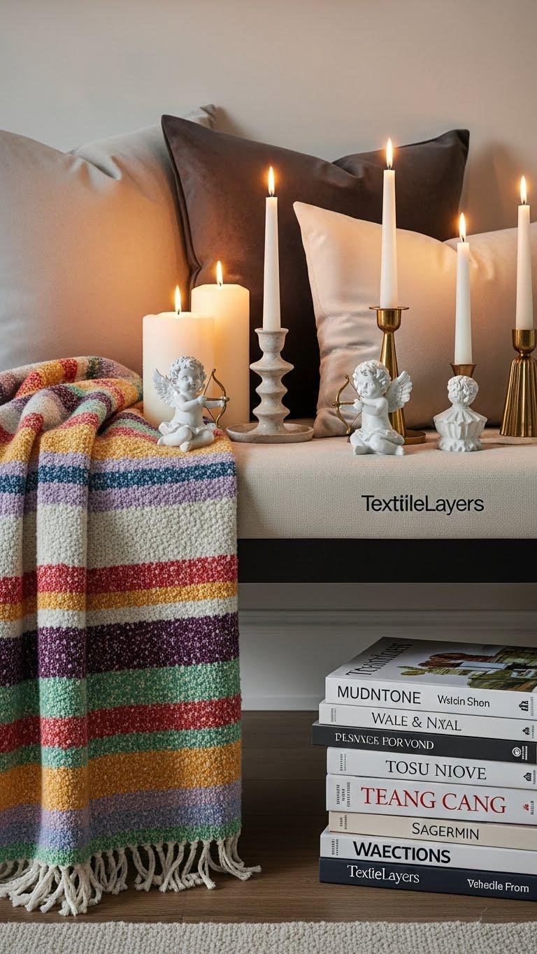 Once you’ve softened the bench with a TextileLayers throw and pillows, bring in playful touches that set a romantic mood: think small cupid figurines, tapered candles in mixed holders, and a stack of coffee table books with pretty spines.