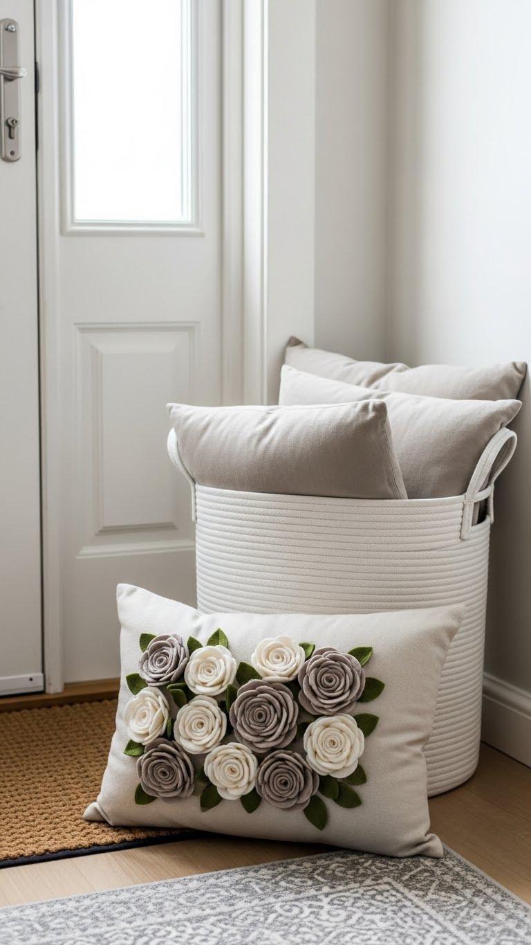 Placed by the door, a white pillow basket with felt roses instantly softens the entry without feeling fussy.