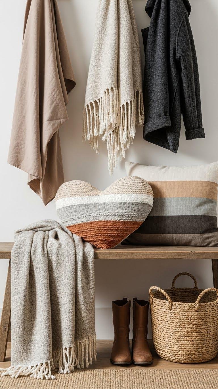 Drape a soft throw over a bench and mix in a couple of heart-shaped pillows to give your entryway an immediate, curated charm.