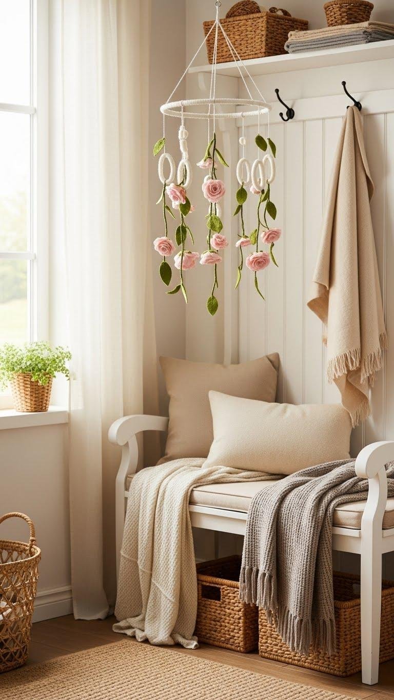 If you liked the soft, layered look on the bench, bring that same cozy charm upward with a Hanging Felt Rose Mobile. You’ll hang delicate felt garland loops and airy hanging stems to create movement and light.