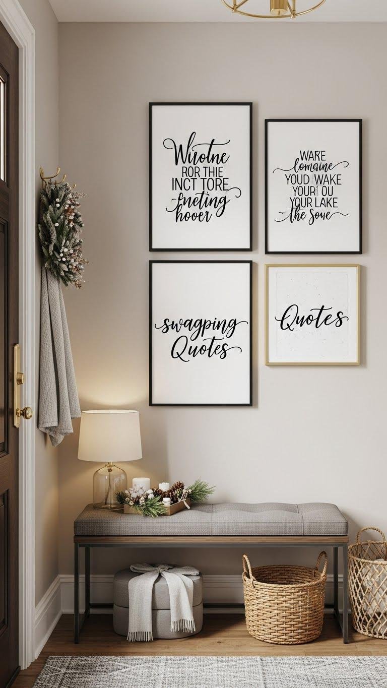 You’ll pick three coordinating prints mixing vintage typography and modern calligraphy for contrast. Frame them in slim black or brass frames, hang at eye level, and swap quotes seasonally.