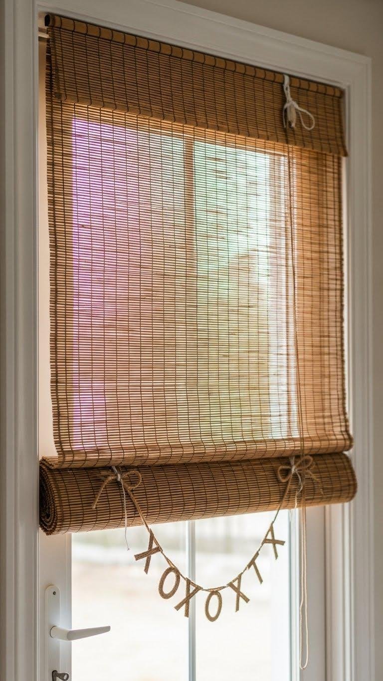 When you want a cozy yet modern touch, hang a woven bamboo or rattan blind and drape a simple XOX garland across the lower third to add playful texture without clutter. You’ll layer woven textures for warmth and subtle pattern, secure garland with discreet clips, and add minimal ribbon accents for movement. It’s effortless, airy, and invites a liberated, personal vibe at your doorway.