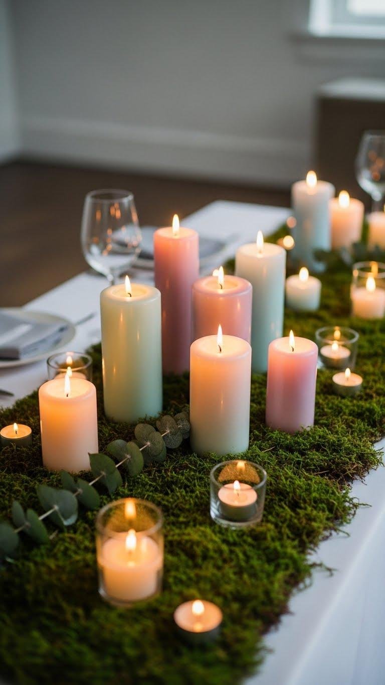 After the airy heart-and-XO mantel, soften the room with a pastel vignette that pairs flickering candles and fresh greenery for a soothing, modern look. You’ll layer pastel candles and tea lights on a low table, nestle a moss runner beneath, and tuck an eucalyptus sprig among votives. The result feels effortless and liberated — refined, minimal, and quietly romantic.