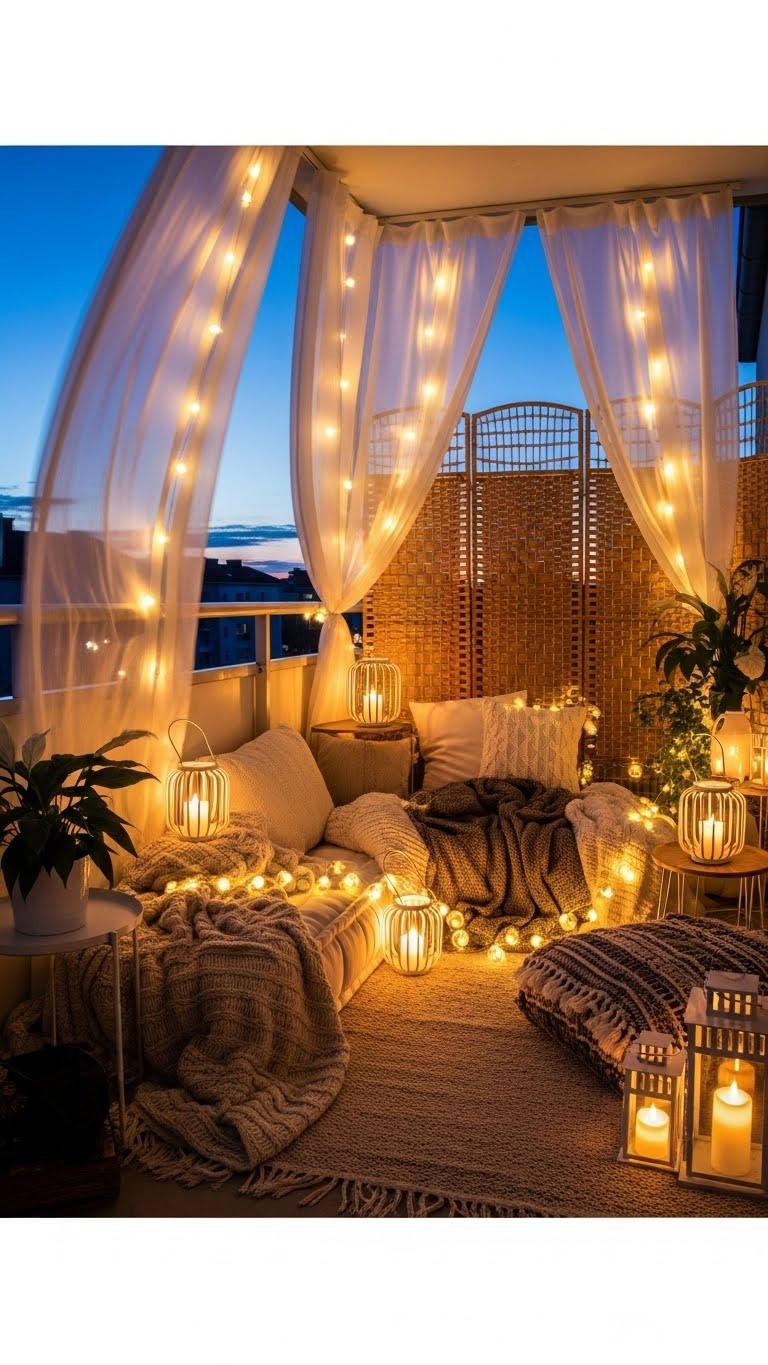 You’ll find that billowing curtains and a halo of warm string lights instantly turn a balcony into a romantic, private nook; lightweight sheer panels soften city drafts while twinkling bulbs define the space after dusk.