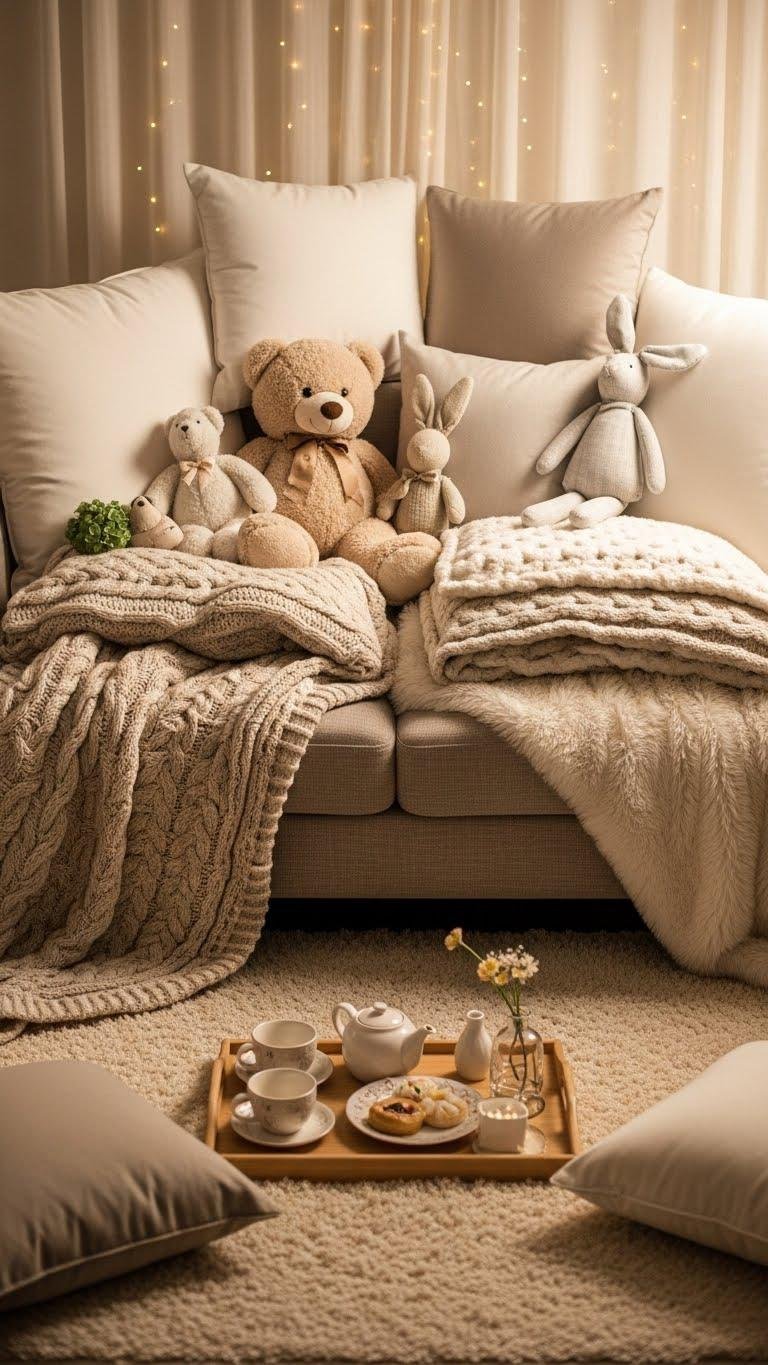 Move the mood from balcony glow to an intimate indoor spot by arranging a two-seater sofa as a cozy date nook framed with soft toys for playful warmth. You’ll curate a plush picnic vibe with layered throws, textured cushions, and a compact tea setup on a tray.