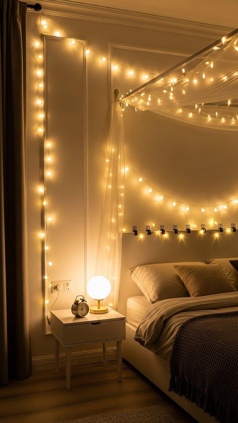 Often a simple string of fairy lights transforms a room into something quietly magical, tracing walls and bed frames with a soft, twinkling outline that feels both modern and intimate.