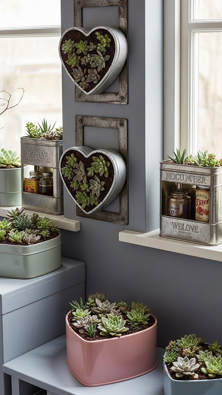 You’ll place a mini succulent in a ceramic heart or repurpose vintage tins as petite displays, mixing matte pastels with raw metal.