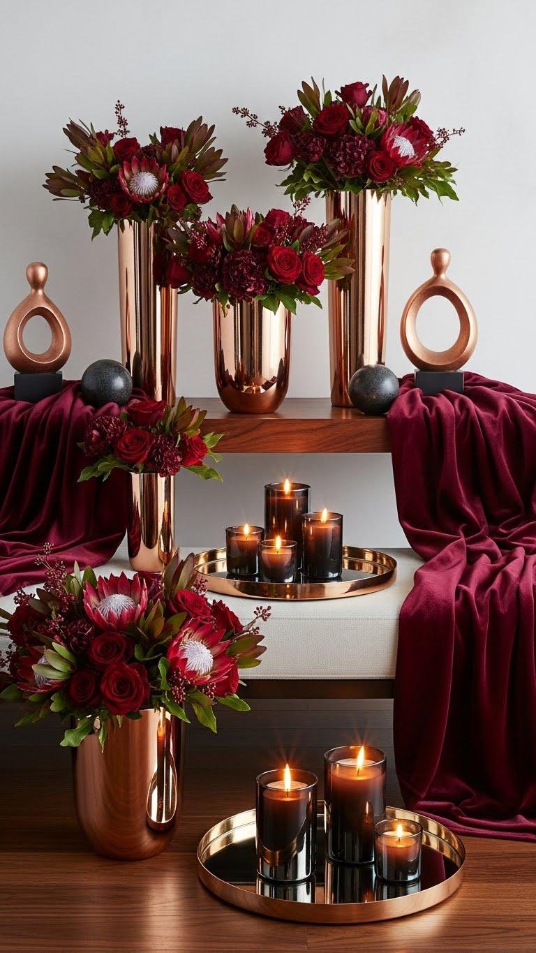 Layer rose gold and burgundy into your scheme to create a luxe, modern Valentine’s look that still feels warm and wearable. You’ll mix metallic vases with deep burgundy textiles, choose sculptural accents, and place reflective candle trays to multiply glow.