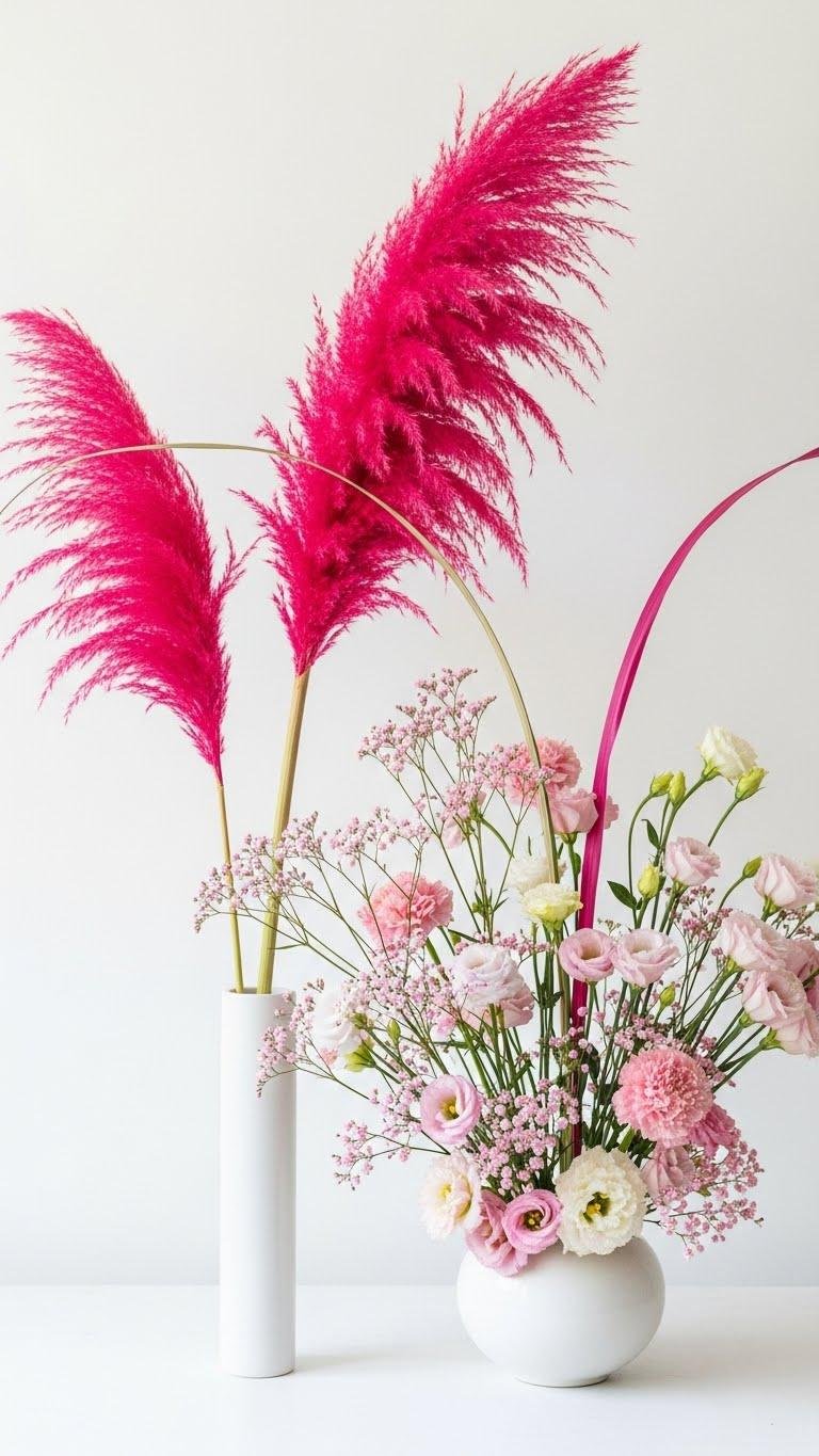 Swap in hot pink pampas grass and soft pastel blooms to give your Valentine’s scheme a playful, contemporary lift that still feels curated. You’ll balance bold texture with airy pastel bouquets, placing sculptural stems in minimalist vases and clustering delicate florals for movement. Embrace unexpected contrasts, let spaces breathe, and choose pieces that reflect your free spirit while keeping the look polished and intentional.