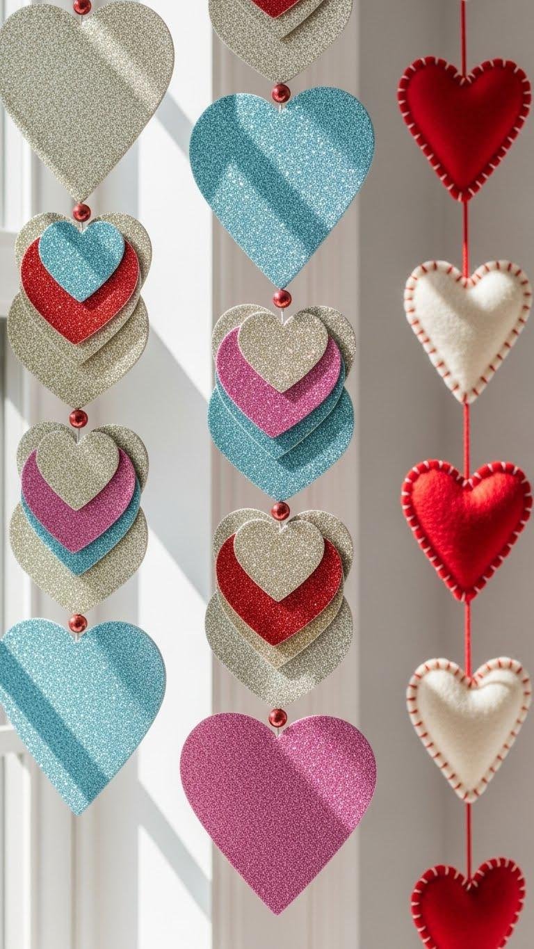 Kick things up a notch with glitter heart crafts made on a Cricut or a tactile felt garland—both give you instant, customizable charm that reads modern and handmade. You’ll design precise shapes, layer glittered garland accents, or stitch felt hearts into a breathable, movable banner. Mix metallic vinyl with soft wool felt for contrast, then hang where light and air celebrate your liberated, curated vibe.
