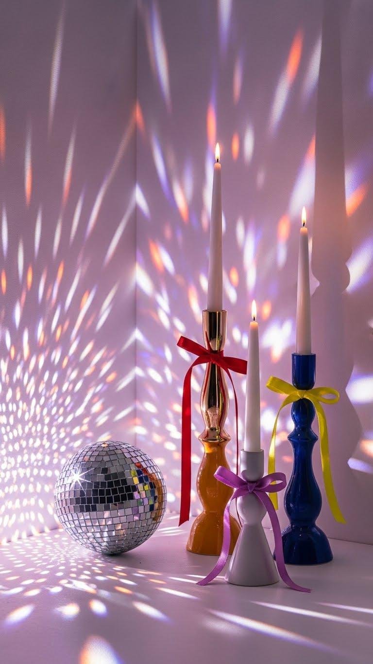 Disco Ball and Ribboned Candlesticks for Sparkle