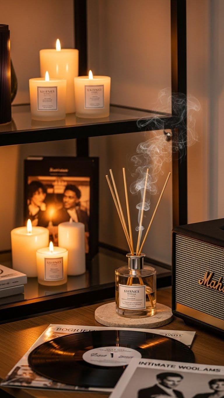 When you step into your corner of the room, let a carefully chosen scent and a short, mood-ready playlist do the heavy lifting: pair a warm, slightly spicy fragrance—think tobacco-rose or bergamot-vanilla—with soft instrumental tracks or intimate vocalists to create a scene that feels both cozy and sophisticated. You’ll craft scented playlists and practice aroma storytelling, layering notes and rhythms so your space feels intentionally free and inviting.