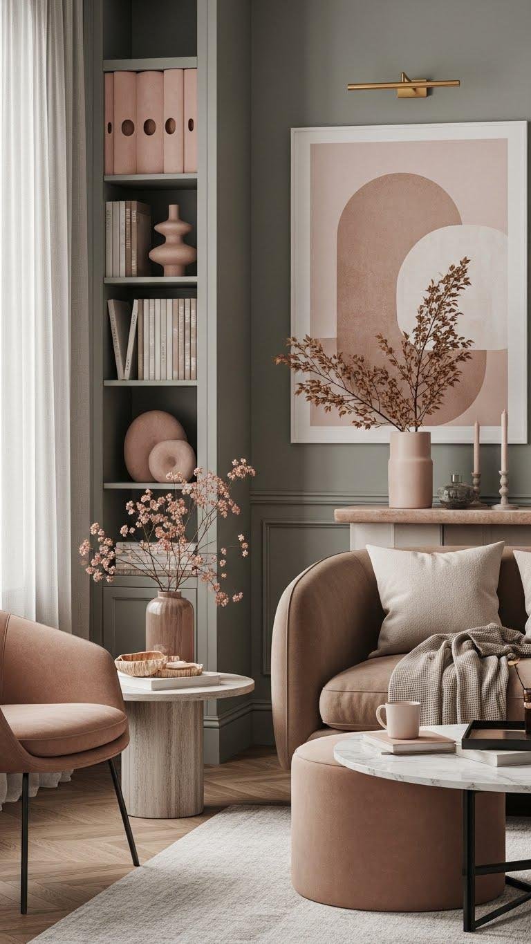 Choose muted sage accents, warm taupe upholstery, and pale linens to create layered serenity.