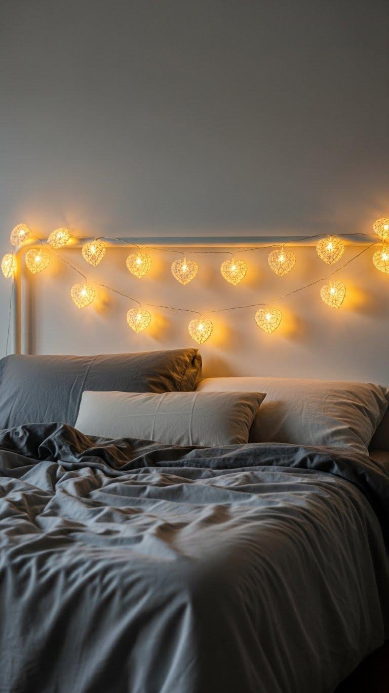 Against a backdrop of soft linens and muted tones, heart-shaped string lights turn your bed into an instantly romantic vignette that’s equal parts playful and polished.