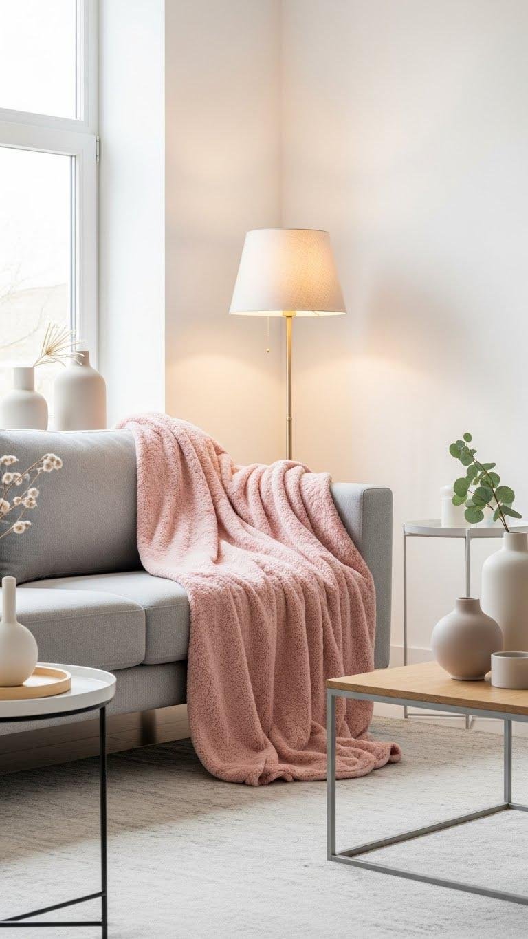Drape a blush plush throw over your living room sofa to instantly soften the space and lend a subtle, romantic glow. You’ll balance blush texture with clean lines, creating intentional contrast that feels liberating.