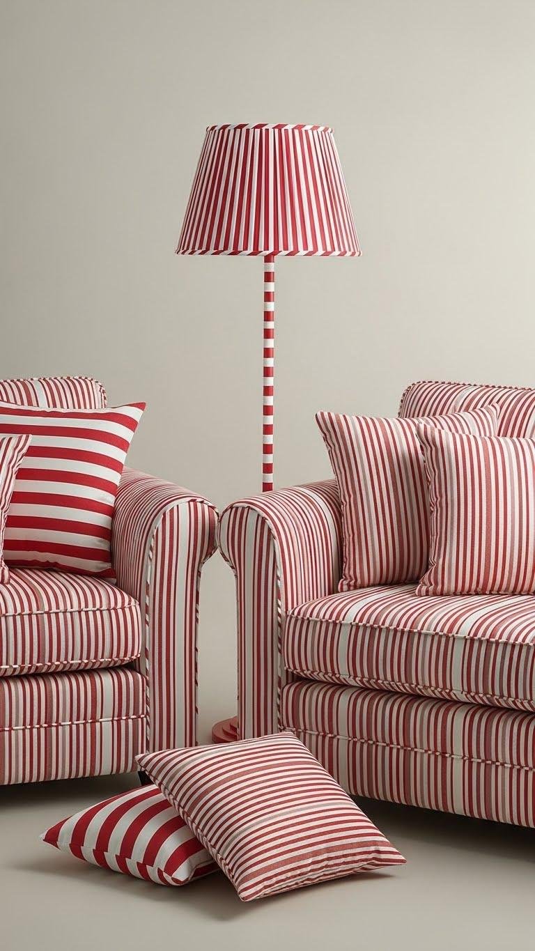 Bring in red-and-white stripe pillow covers to inject playful charm and graphic contrast into your seating—mix narrow and wide stripes for rhythm, then anchor them with solid neutrals to keep the look polished. You’ll pair them with a striped loveseat for spirited seating and echo the motif with a candy striped lampshade. Opt for crisp fabrics and removable covers for easy seasonal freedom.