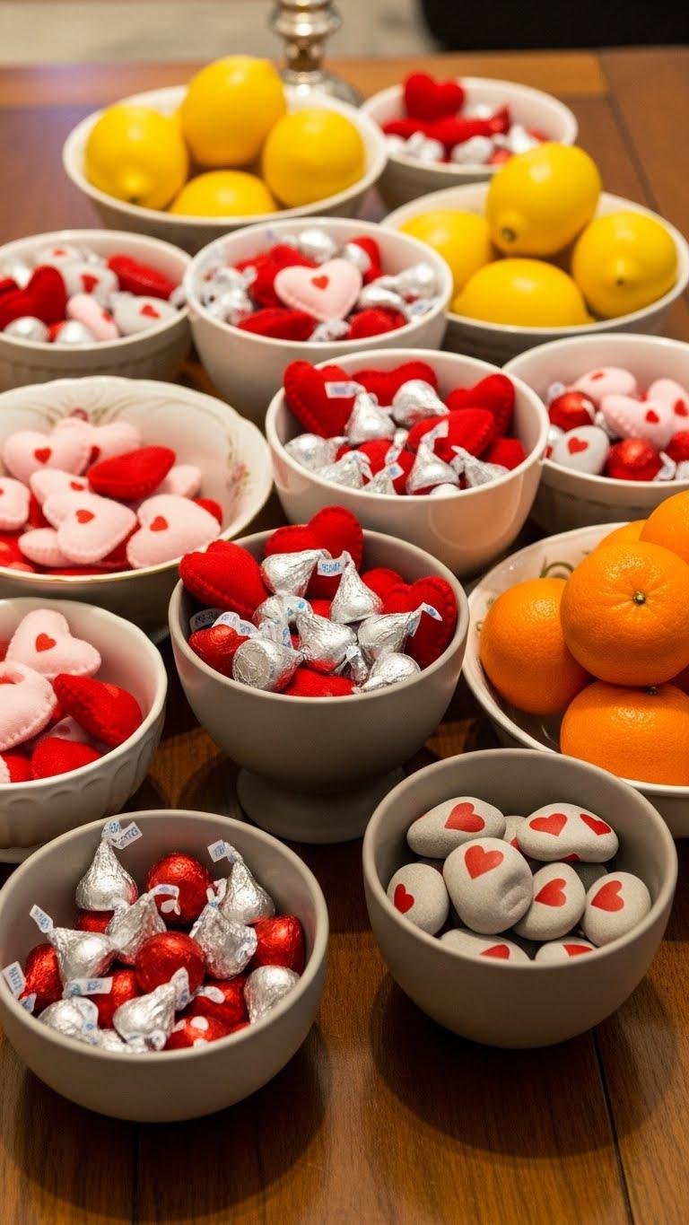 Choose vintage porcelain pieces mixed with modern glass or matte ceramics, and fill them with tiny felt hearts, chocolate kisses, or painted pebbles. Arrange varying heights and a couple citrus bowls for contrast; the result feels curated, playful, and effortlessly free-spirited.