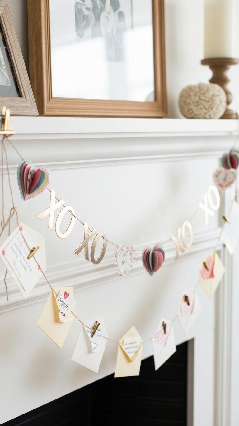 String a delicate garland of mixed-media hearts and XO cutouts across your mantel to make a chic, modern statement that still feels warm and personal. You’ll layer handmade paper hearts with metallic XO shapes, spacing pieces for airy rhythm.