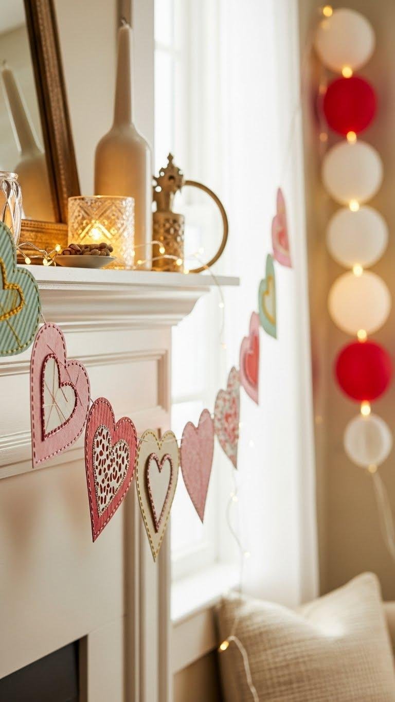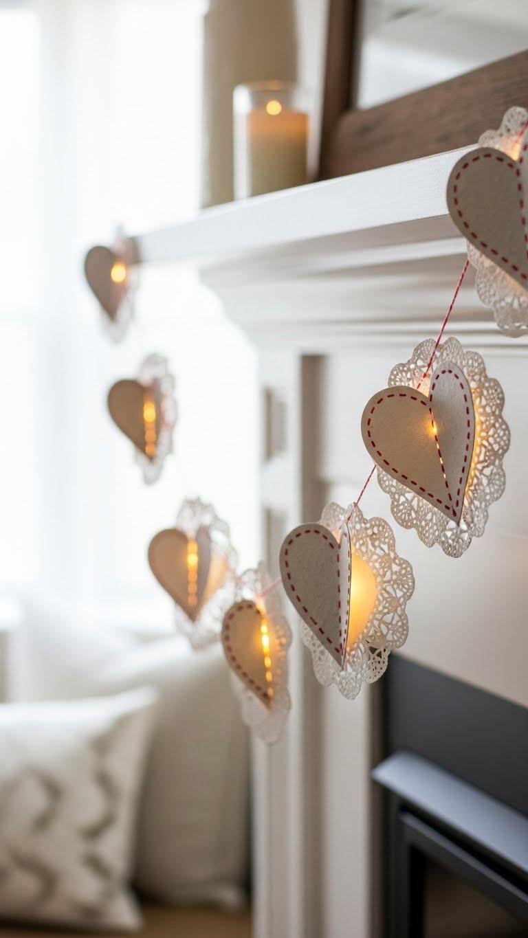 For a timeless, tactile Valentine’s accent, craft a paper heart and doily garland that blends vintage charm with modern minimalism. You’ll stitch recycled paper hearts to delicate doilies for a light, airy scalloped edge garland that reads intentional, not fussy. Hang it across a mantle or window; it’s effortlessly personal, sustainable, and gives your space a liberated, curated feel without clutter.