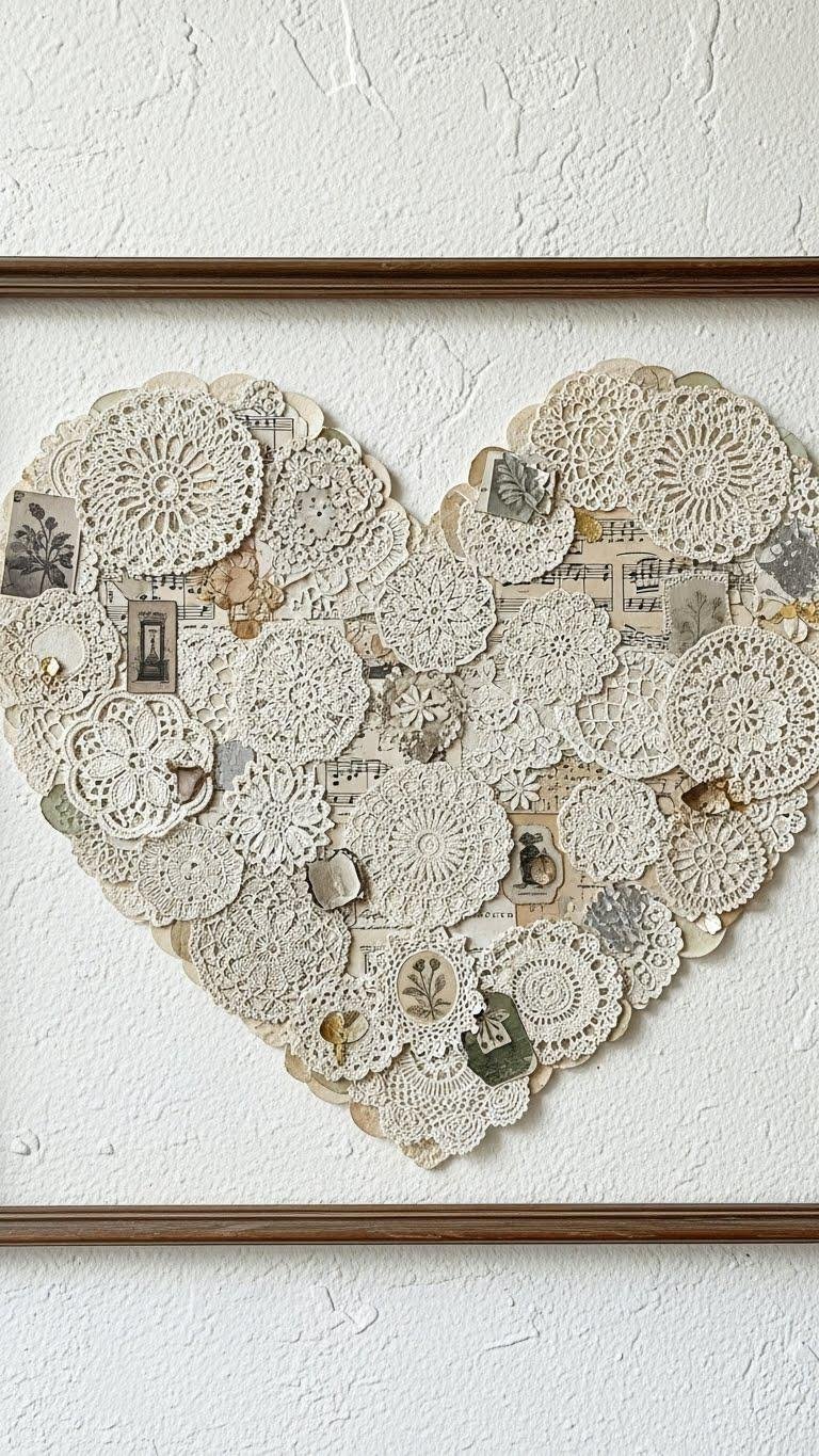 Vintage doily heart collages bring a crafted, nostalgic charm to your Valentine’s wall without feeling kitschy, and you can layer them to create a textured focal point that reads both romantic and refined. You’ll mix antique lacework doilies, muted papers, and subtle metallics, then arrange them in balanced clusters.