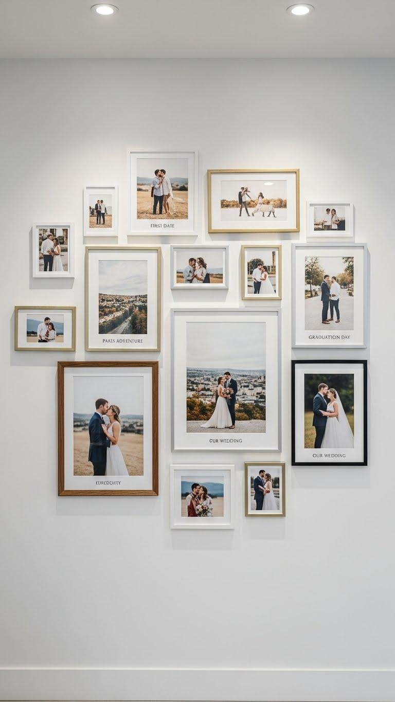 Lay out your love story in a linear, gallery-style display that guides the eye and marks meaningful moments—this Chronological Milestone Photo Wall turns memories into a curated timeline. You’ll arrange a clean milestone timeline of prints, mixing sizes and textures, adding concise photo captions for context. It feels modern and liberated, letting you celebrate progress, adventures, and small triumphs with thoughtful, unforced design.