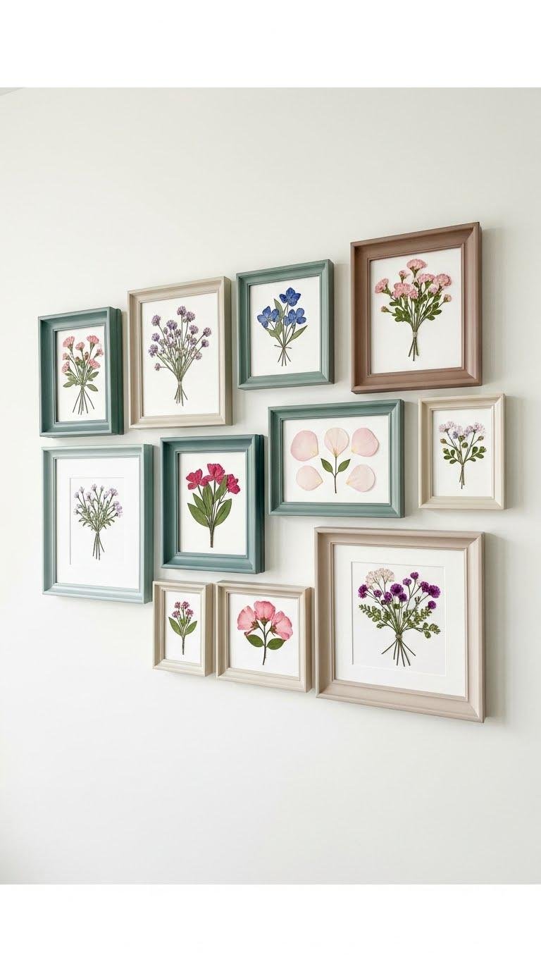 Curate a small floral cluster gallery to add delicate, artful pops of color without overwhelming your space; group several modest arrangements in matching frames or shadow boxes and vary scale and spacing for a modern, collected look.
