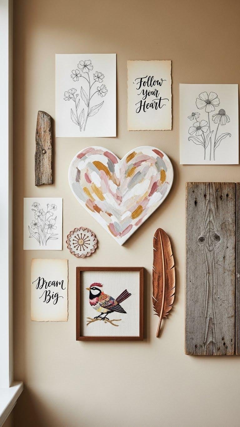 If your hand‑painted heart canvas sets the tone, a mixed material gallery wall builds the story—layering prints, textiles, wood, metal, and hand‑lettered phrases for texture and meaning.