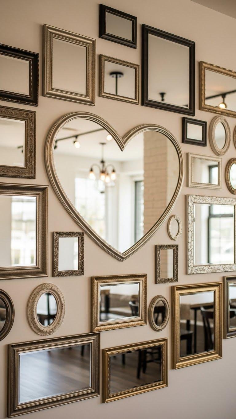 Layer a heart-shaped mirror with a curated array of frames to make a bold, modern statement that still feels warm and personal. You’ll play with reflective texture and matte surrounds, balancing light and shadow. Consider eclectic frame placement—tight clusters for intimacy or spaced rhythm for breathability—so your wall reads confident and free, inviting viewers to see themselves in a stylish, intimate vignette.