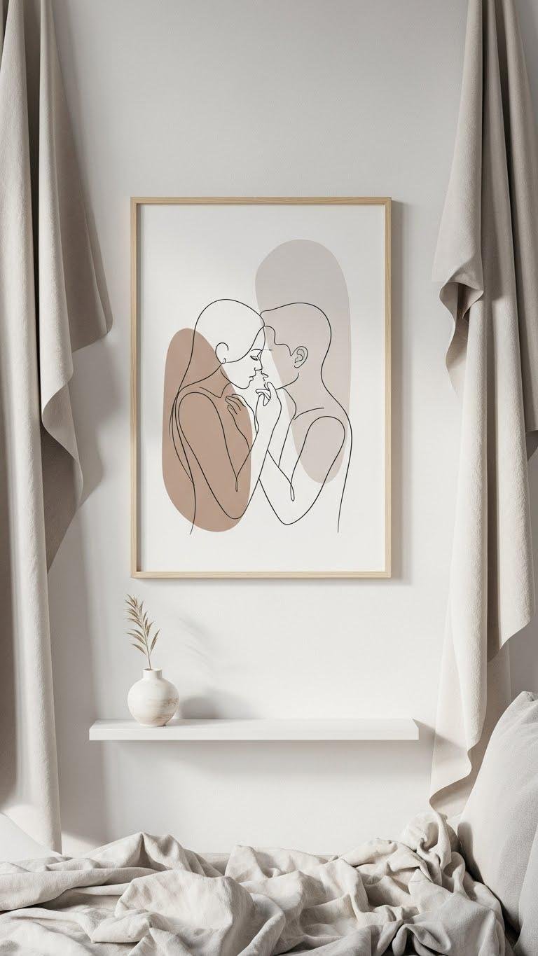 After you’ve played with mirrors and mixed frames, a framed line-art couple illustration brings a softer, more intimate focus to the wall.