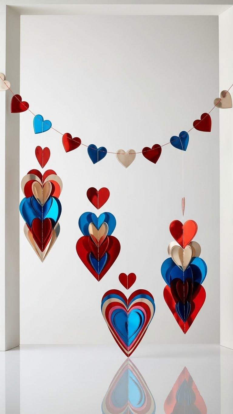 After the soft glow of an LED balloon garland, switch to a craftier, tactile layer with a sewn cardstock heart bunting that adds handmade charm to your Valentine setup. You’ll enjoy assembling a stitched garland using mixed papers, metallic thread, and varied heart bunting sizes for rhythm. Hang it freely across mantels or windows to express personal style and effortless, modern romance.