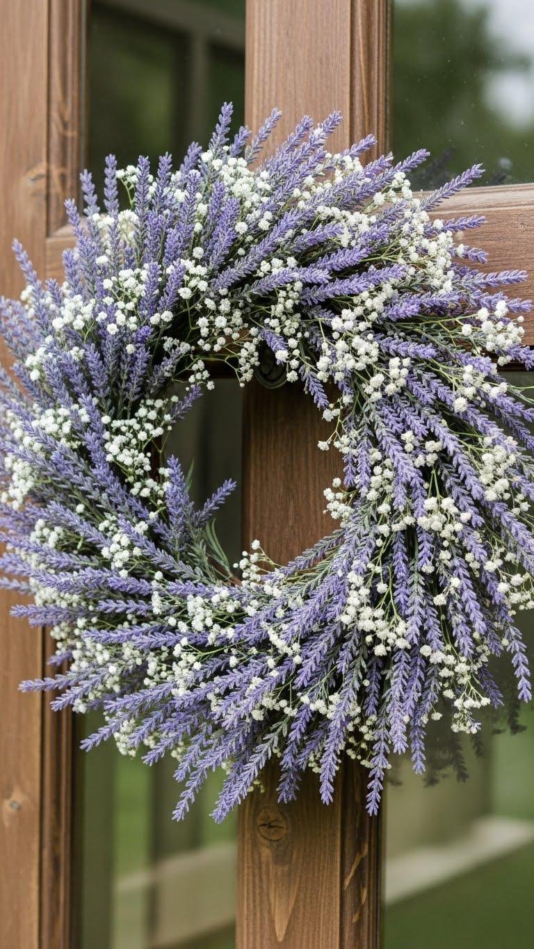Bring a soft, romantic hush to your door by crafting a lavender and baby’s breath wreath that feels effortless yet refined. You’ll celebrate lavender symbolism of calm and devotion while arranging a delicate baby’s breath arrangement for airy texture. Skilled yet simple, this wreath suits a free-spirited aesthetic, uses natural materials, and lets scent and silhouette whisper romance without competing with other decor.