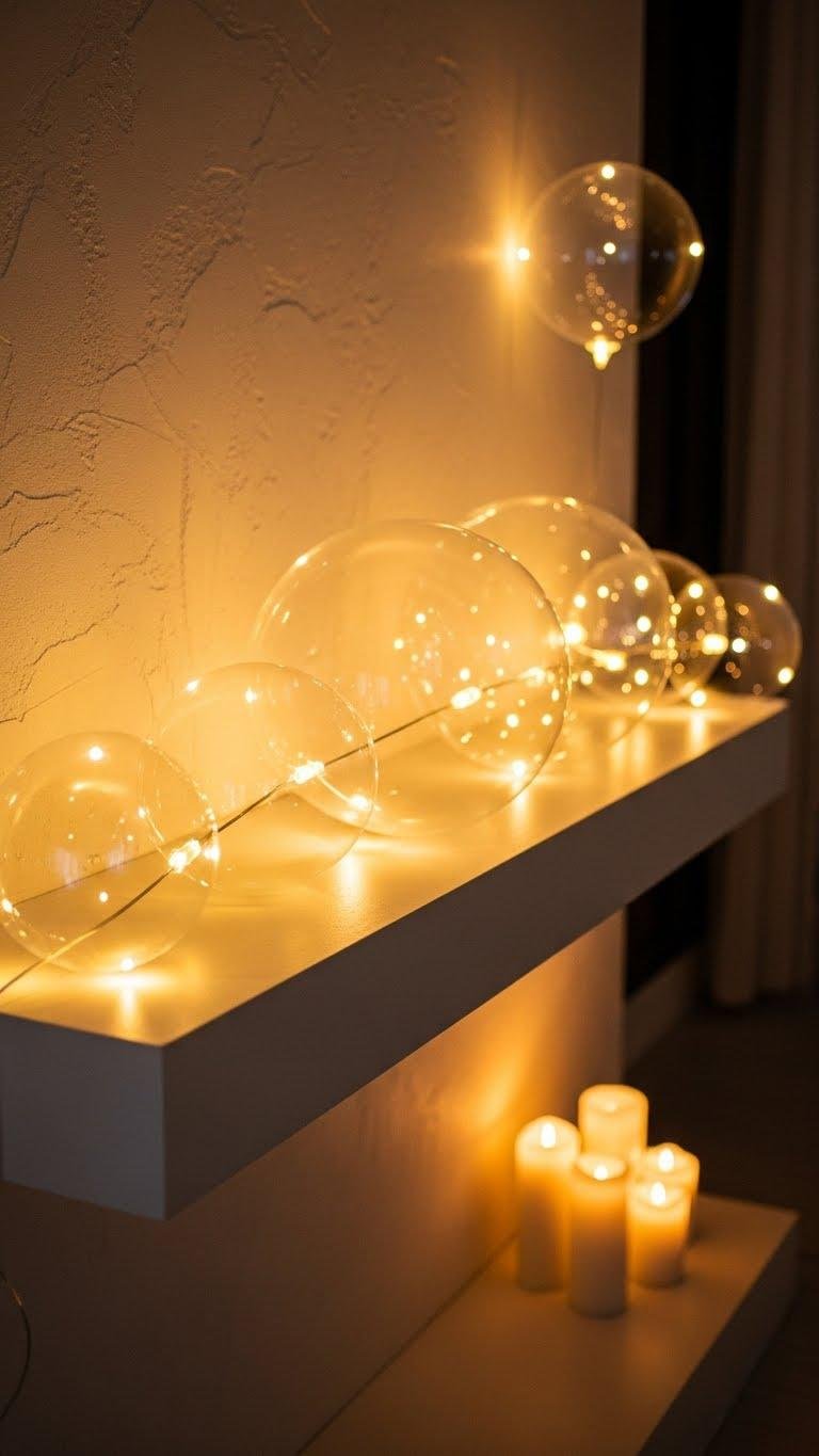 Light a space with playful drama by draping an LED-backlit balloon garland across your mantel or entryway, where soft internal lights make translucent balloons glow like floating orbs.