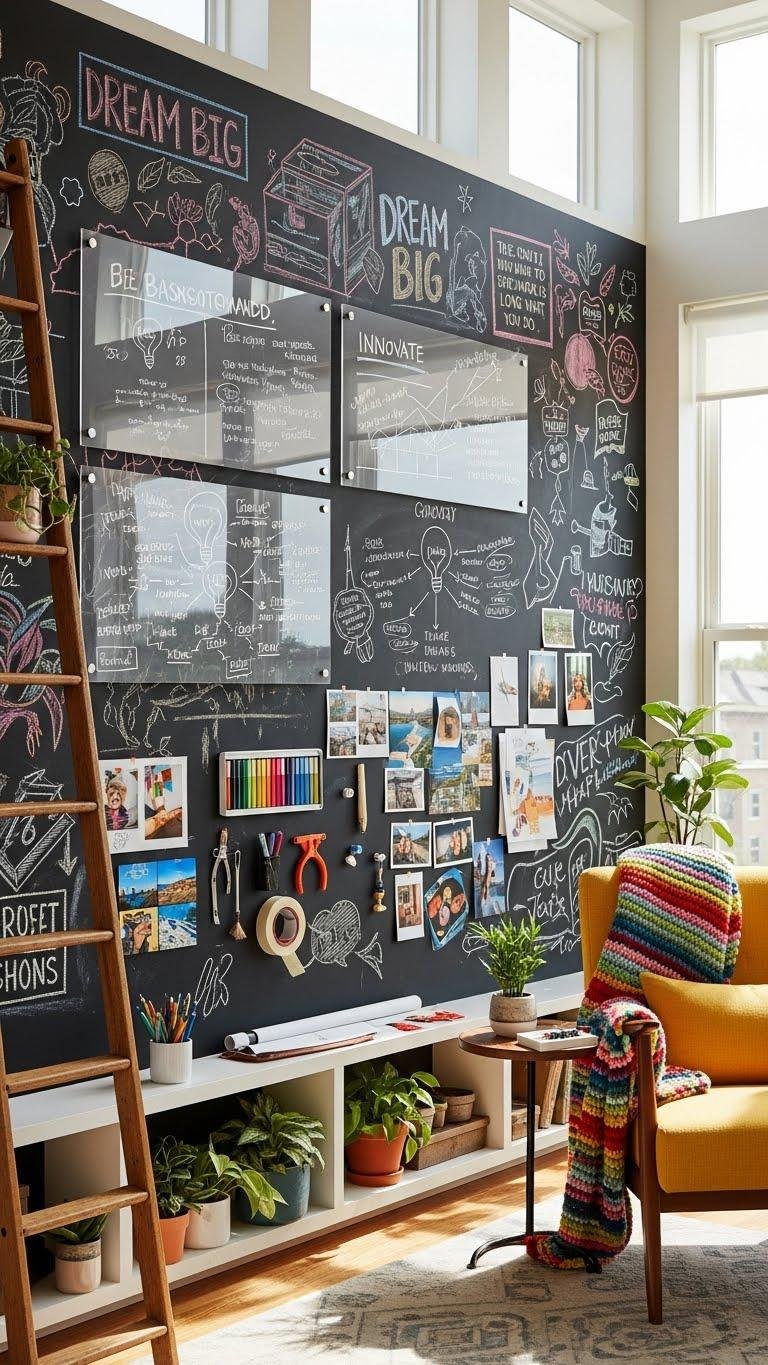 After enjoying sculptural depth, give a wall a different kind of life with chalkboard or writable panels that invite interaction. You’ll sketch plans, quotes, or evolving ideas directly on a DIY chalkboard surface, then erase and reinvent.