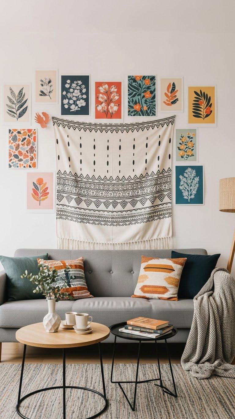 After an eclectic gallery of prints has filled your wall with personality, bring a Bohemian tapestry in as a single, magnetic focal piece that anchors the room and softens the mix.
