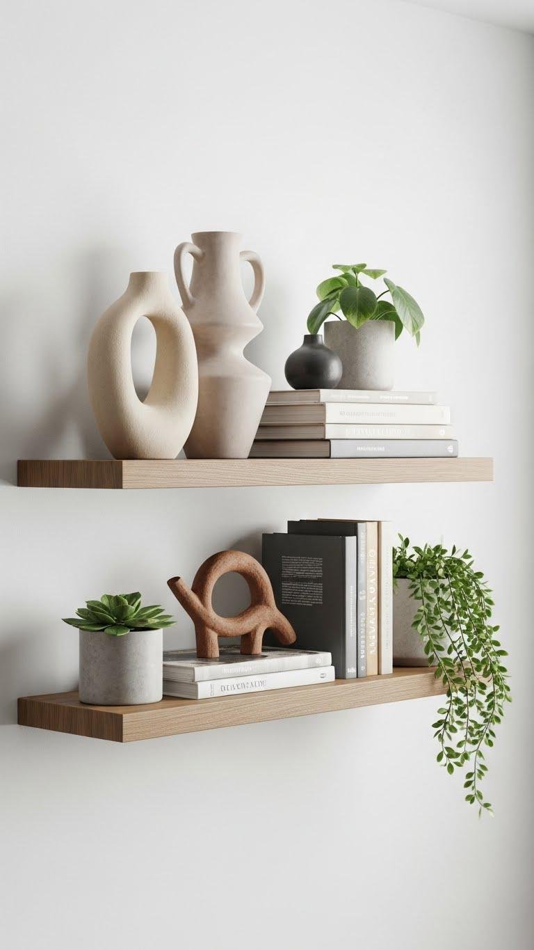 Lean into layered simplicity with floating shelves that showcase a few curated pieces—think a sculptural vase, a stack of well-loved books, and one unexpected object that sparks conversation.